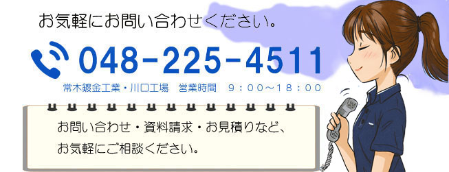| 常木鍍金工業株式会社 〒332-0001 埼玉県川口市朝日5-4-18 TEL.048-225-4511 FAX.048-225-4350 Mail.info@tsuneki-mf.co.jp |